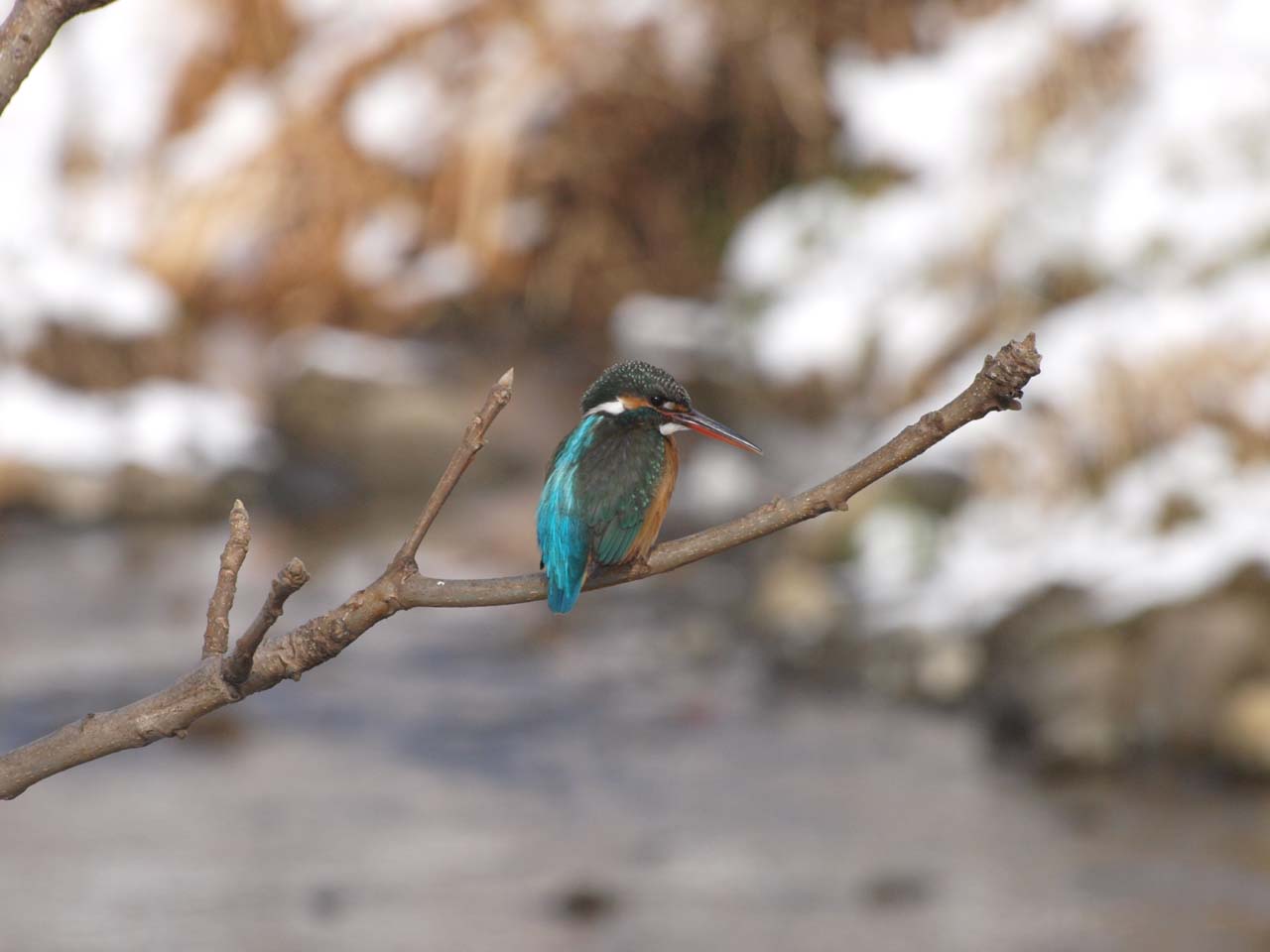 サクラの木に止まるカワセミ。2008年2月4日9時14分。Olympus E-3 ED70-300mm F4.0-5.6。300mm(600mm相当)、1/1000秒、F13.0。ISO800。+0.3EV。 |