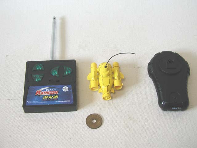 | こちらは増田屋製。真ん中が本体。大きさを5円玉と比べています。左が操縦器、右は充電器(電源は乾電池)。 | こちらはミツワモデル社製。増田屋のものと大きさはほぼ同じ。動きが遅いのでこちらの方が操縦は楽。深海潜水調査船の形とライトもいい。ただ、増田屋のものより少し高い。 |