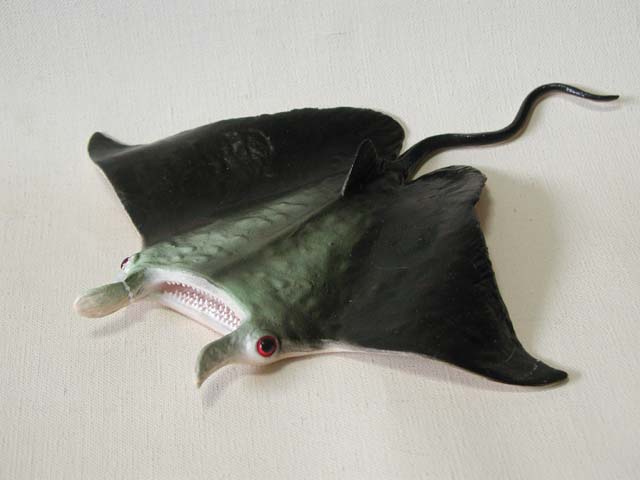 | 地球上最大の魚(軟骨魚類)のジンベイザメ。最大で20m近くにまでなるらしい。1/20模型。水族館の人気者。 | 特異な頭をしたシュモクザメ。目の間の距離が大きいので、立体視が得意? |