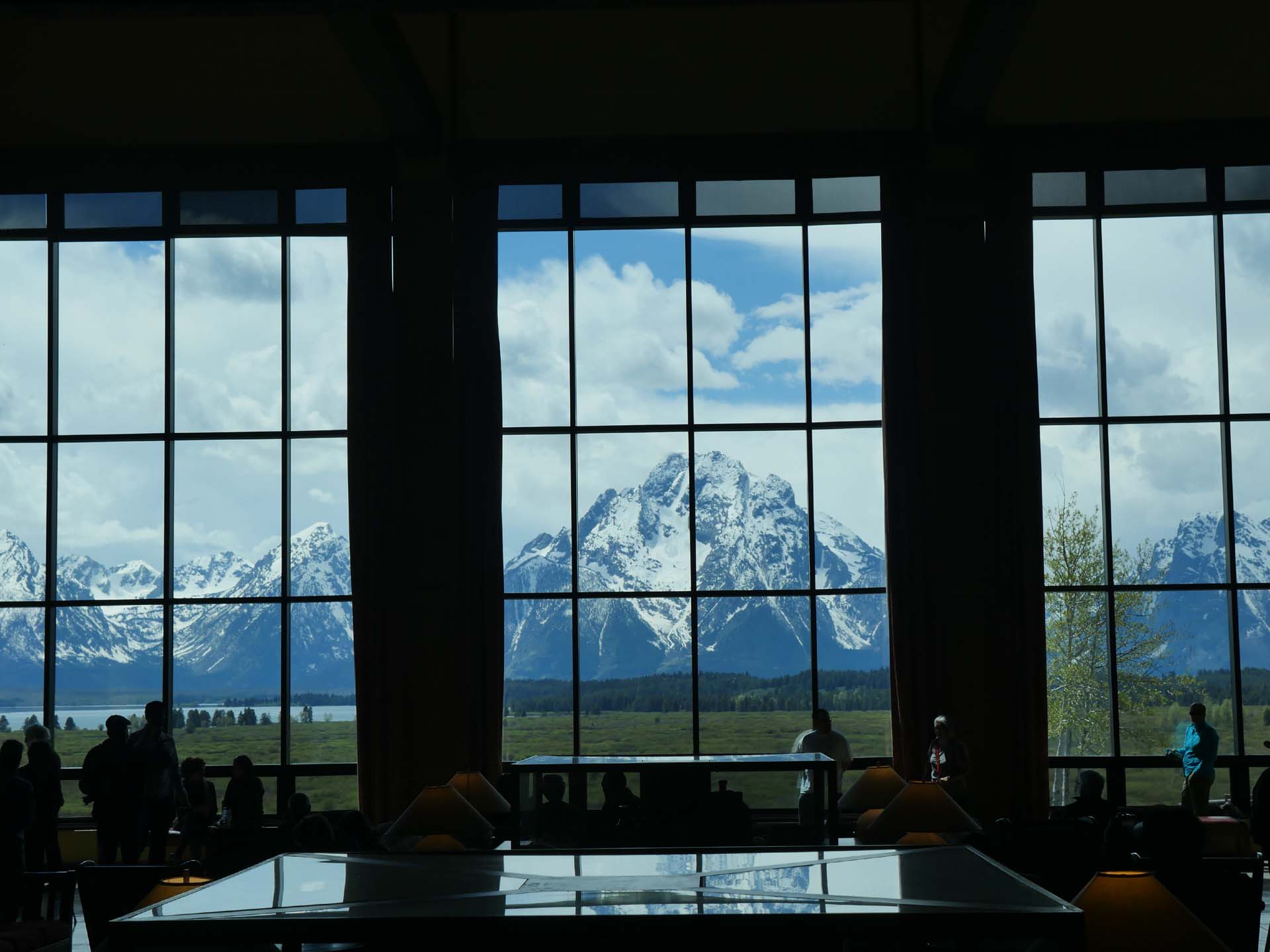 まず立ち寄ったのは、公園の北側に位置するジャクソン・レイク・ロッジ。2階の窓から見る、切り取ったテイトン山脈が売りのホテルです。ロッジ周辺で展望を楽しんだあと、今度は湖沿いの道を南下します。最初に立ち寄ったのは、モラン山ビューポイント。次はビジターセンターのあるジョニレイク。色々なところで工事中でした。それでも、湖畔まで出てみました。最後に立ち寄ったのはトランスフィギュレーション教会です。
