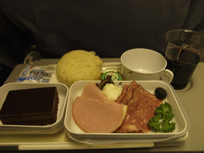 16時近くに第1回目の機内食が出ます。イタリアン(魚)と和食(肉)が選べます。イタリアンにしました。21時ころおやつタイム、おにぎりかサンドウィッチを選べます。サンドウィッチにしました。着陸の1時間ほど前に第2回目の機内食が出ました。