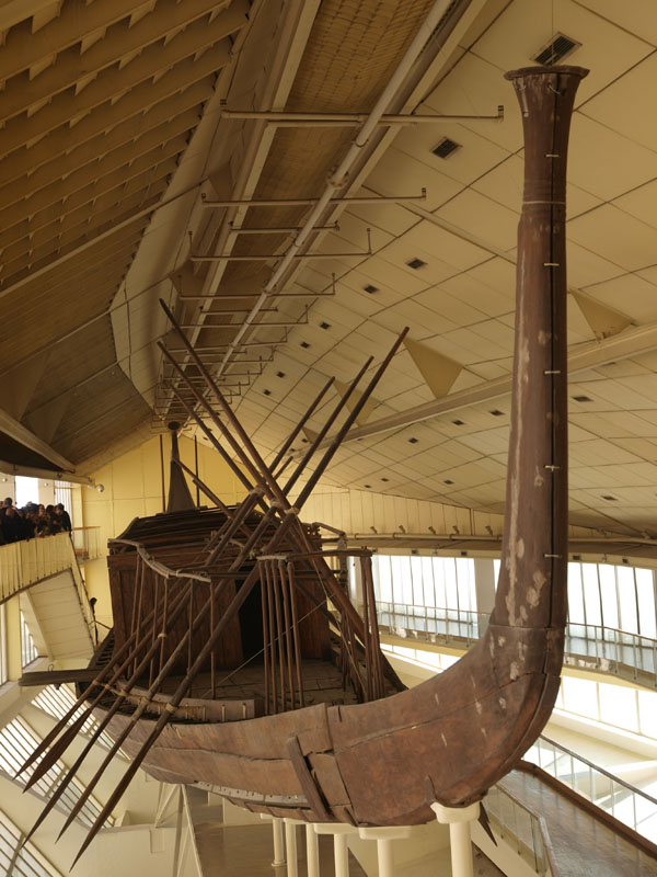 最初は最大の第4王朝第2代クフ王(在位紀元前2589年ころ〜紀元前2566年ころ)のピラミッド。もともとは高さ146.6mありましたが(頂上にその高さを示す鉄パイプのピラミッド)、いまは最上部が崩れて137mです。ここは内部に入って見学しました(撮影は禁止)。急な傾斜の階段を登って“玄室”まで行くことができます。急傾斜で、おまけに蒸し暑いので結構大変です。その後、後に回り込んで、ピラミッド脇から発掘された巨大な「太陽の船」(ラー神とともに来世への最後の旅をしたという木造船、レバノン杉でできている)を展示している博物館の見学です。いまから4500年以上も前のものなのに、その保存状態の良さにびっくりします。ナイフ(石器)やハンマー(花こう岩のかたまり)などの工具も展示してあります。よくこんな貧弱な道具で、このような立派な船ができたものだと感心します。