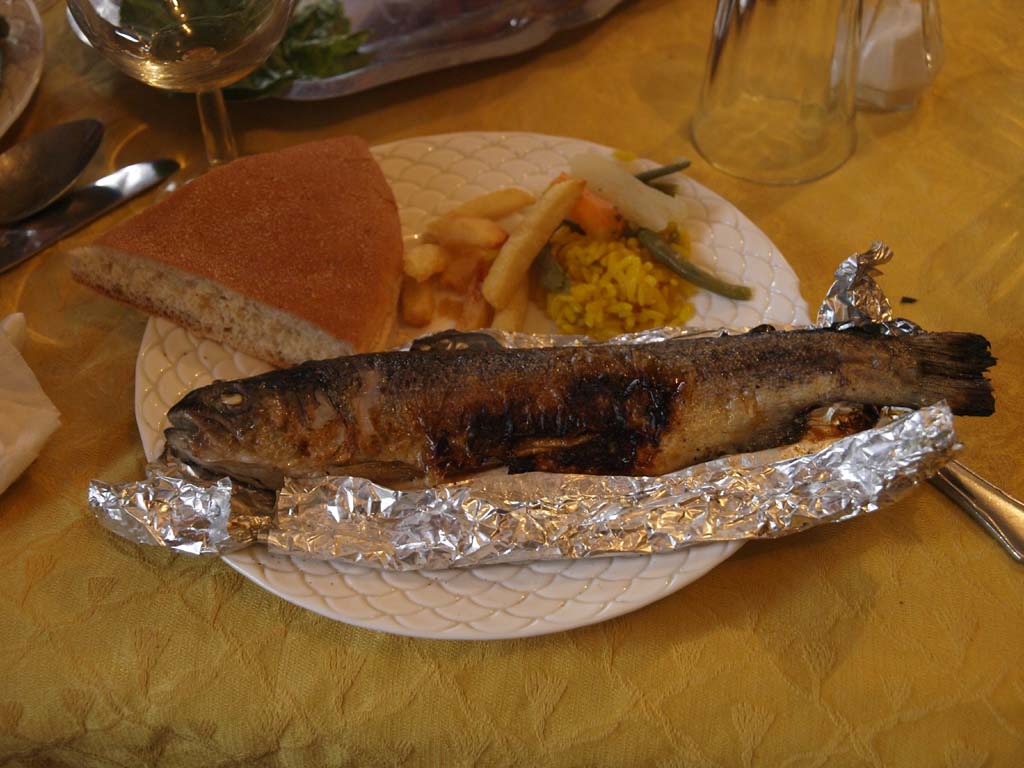 昼食はミデルトという街の、その名もカスバというレストランで淡水魚料理(マス?)のホイル焼きでした。昼食を食べたレストランの近くには化石やさんもありました。途中でも化石やさんを見かけたので、この辺りはたくさん化石が出るようです。中をのぞいたら、おもにアンモナイトや魚の化石でした。