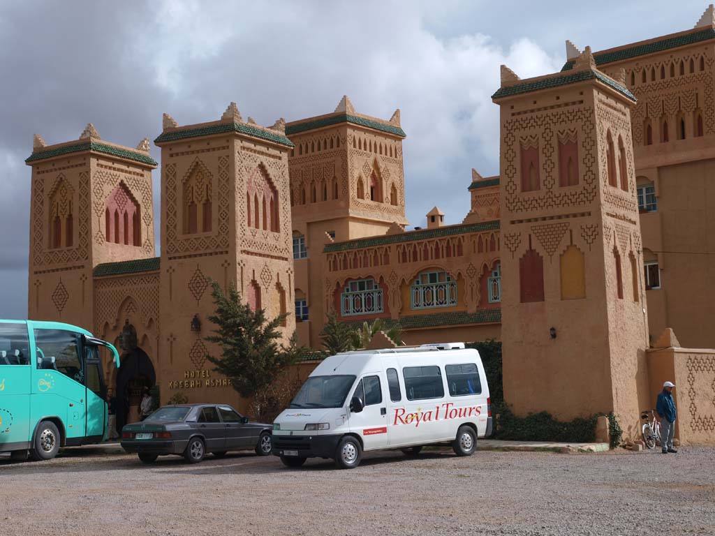 もう1回休憩を入れたドライブインのまわりにはおもしろい形、地層が見られる山々、遠くには雪を抱いた山々も見えました。さらに進むズィズ川が刻んだズィズ峡谷、またズィズ川のまわりには緑のオアシスという風景になります。