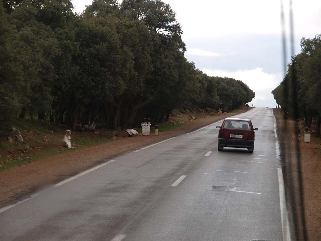 | ほぼ満月。 | ヨーロッパを思わせるイフレンの街並み。 | 冷たい雨やみぞれが運転席の窓をたたきます。雪を抱いた山も見え始めます。 | ザダード峠は雪景色。アトラス杉がクリスマスツリーに。 | ザダード峠のロバ。 |