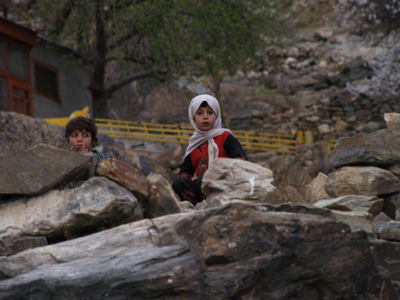 | ギルギット川沿いの岸壁に見られる大不整合。下の民家でスケールがわかります。 | ギルギット近くで見られる巨大なカルガ磨崖仏。拡大はこちら。周囲全体はこちら。 | 磨崖仏近くの村の子ども。 | 雪崩が道をふさいでしまいました。復旧工事を行っているブルドーザーや、雪崩を登って乗り越えようとする人たちが見えます。 | ポーターが荷物を担いで雪崩をよじ登っています。 |