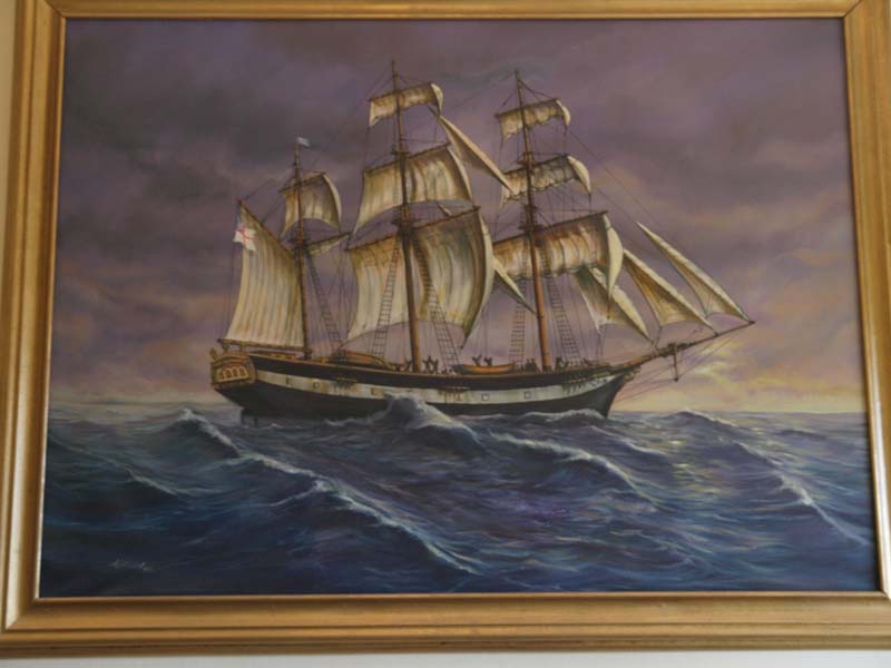| ホテルの看板。もちろん名前を勝手に使っているのでしょう。 | ホテルのロビーに飾ってあったビーグル号の絵。 | ピスコ・サワーを作ってくれるご主人。 | メインのコンガイル(白身魚)、ご飯付き。 | ホテル前の歩道。コンクリートが乾かないうちに犬が歩いてしまったようです。パタゴニアは野良犬(大型犬、でもおとなしい)が多いところでした。 |