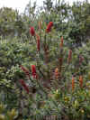 | ハイキングの起点となる駐車場近くの斜面には、けもの道がはっきりと見えます。きのうウォンバットがいた場所です。 | ロニー・クリークを起点とするハイキングコースの案内板。 | ウッドウォークの上を歩くハイカー。 | 氏名不詳。 | きれいな花(氏名不詳)の蜜を吸っている虫がいました。 |