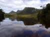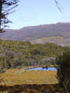 | ウォンバット・プールまで降りてきました。溶けているタンニンのために水が赤く見えます。 | パンダニが花を咲かせていました。 | リラ湖から見るクレイドル山です。 | お昼を食べた岩。節理が見られ、その一つが溝となり、リラ湖からの水が流れ出しています。 | ボタングラスの草原。もうゴールは近い。 |
