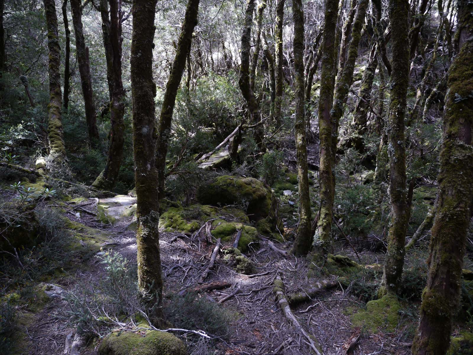 | これがキング・ビリー・パインです。説明はこちら。 | 森の音をお聞きください。youtubeにリンクしています。 | クレイドル山が見えるところがありました。 | 地塘がありました。 | 南半球なので影が南側に伸びています(15時の影が南東に伸びています(ホバートの偏角は東偏約15°なので、本当の南北方向は磁針の南北方向から左回り(反時計回り)に約15°回転した方向となります))。 |