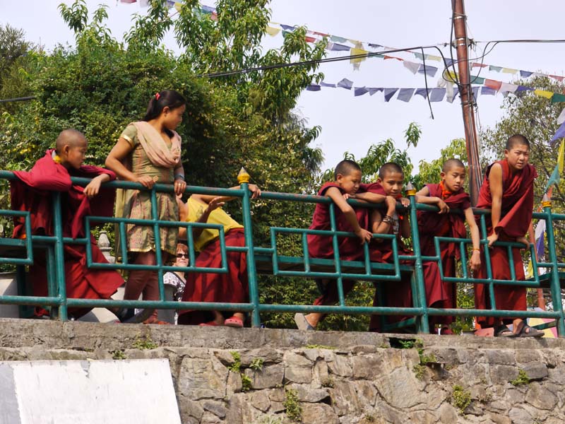 | 観光客を眺める少年僧。 | 町並みが保存されいてる旧市街。でも、お店は更新されていて、ここは携帯電話屋さん。 | 旧市街の露店。 | お寺の庇の下はデート・スポットらしい。 | 昔は無かったバイクがたくさん。 |