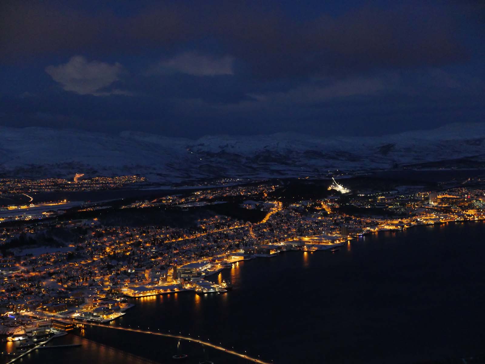 | 泊まったホテル(ラディソンブルー)の8階の空中渡り廊下から外を見ています。 | ストールスタイネン山(430m)からトロムソの夜景を見ています。 | こちらはトロムソ大学やスキーのジャンプ台。 | ロープウェイの駅はこじんまりとした小屋です。 | ロープウェイ駅近くは住宅地になっています。 |