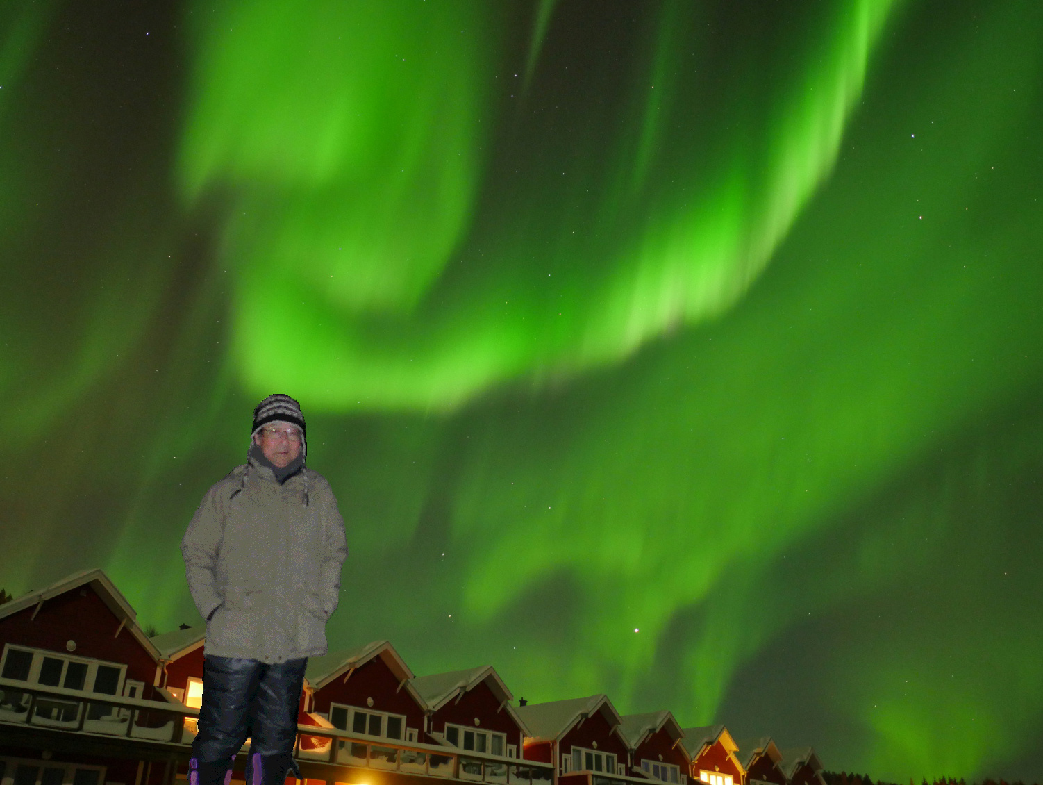ホテル横の桟橋に出ると、淡いオーロラが出始めていました。そしてみるみる明るくなり、壮大なオーロラ・ショーとなりました。この環境は明るすぎると思ったのは杞憂でした。2時間ほど楽しんだあと、ホテルに戻りました。明日の出発は8時45分なので、寝る前にスーツケースの荷造りをだいたい終えておきました。