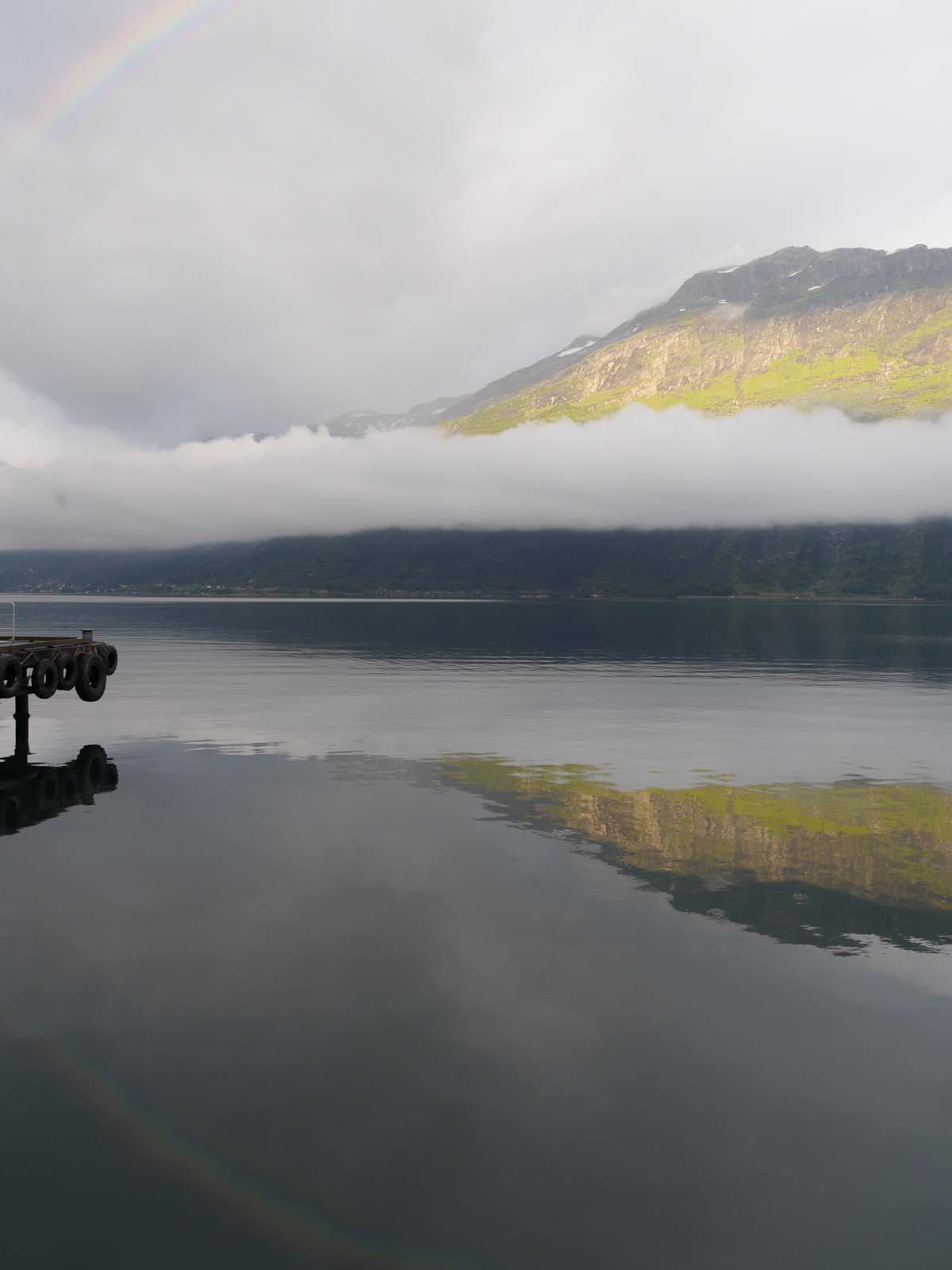朝食前、ホテルの庭を散策します。雨が上がり虹も出ました。対岸の氷河を戴く山々の稜線も見え出します。