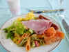 | 港近くの市場。その場で食べることもできます。 | この辺は魚卵(キャビア)を売っています。 | この辺はカニとエビ。果物はこちら。 | 夕食の野菜スープ。ビールはハンザのピルスナー。 | サーモングリル。お米はトルコ米だそうです。デザートはチョコレートケーキでした。 |