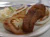 | 朝食です。一番上がタピオカのパンケーキです。料理しているところはこちら。 | ブラジルは今、州の選挙の真っ最中。候補者の番号を振っています。 | アマゾン自然博物館で展示されているピラニアの剥製。 | こちらは生きているピラルク。顔のアップはこちら。 | モルフォチョウ。 |