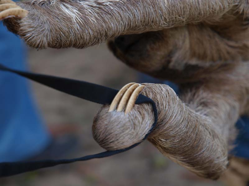 | カルロダバージャ島の美少女のペットのナマケモノ。三本指のミユビナマケモノです。 | オオオニバスの花が咲きそうです。 | アマゾン川に沈む夕日。川面が金色に染まります。 | 夕食です。川魚のスープをご飯にかけて食べました。 | 捕まえた子ワニ(カイマン)。口のアップはこちら、目(瞬幕を閉じようとしている)はこちら。 |