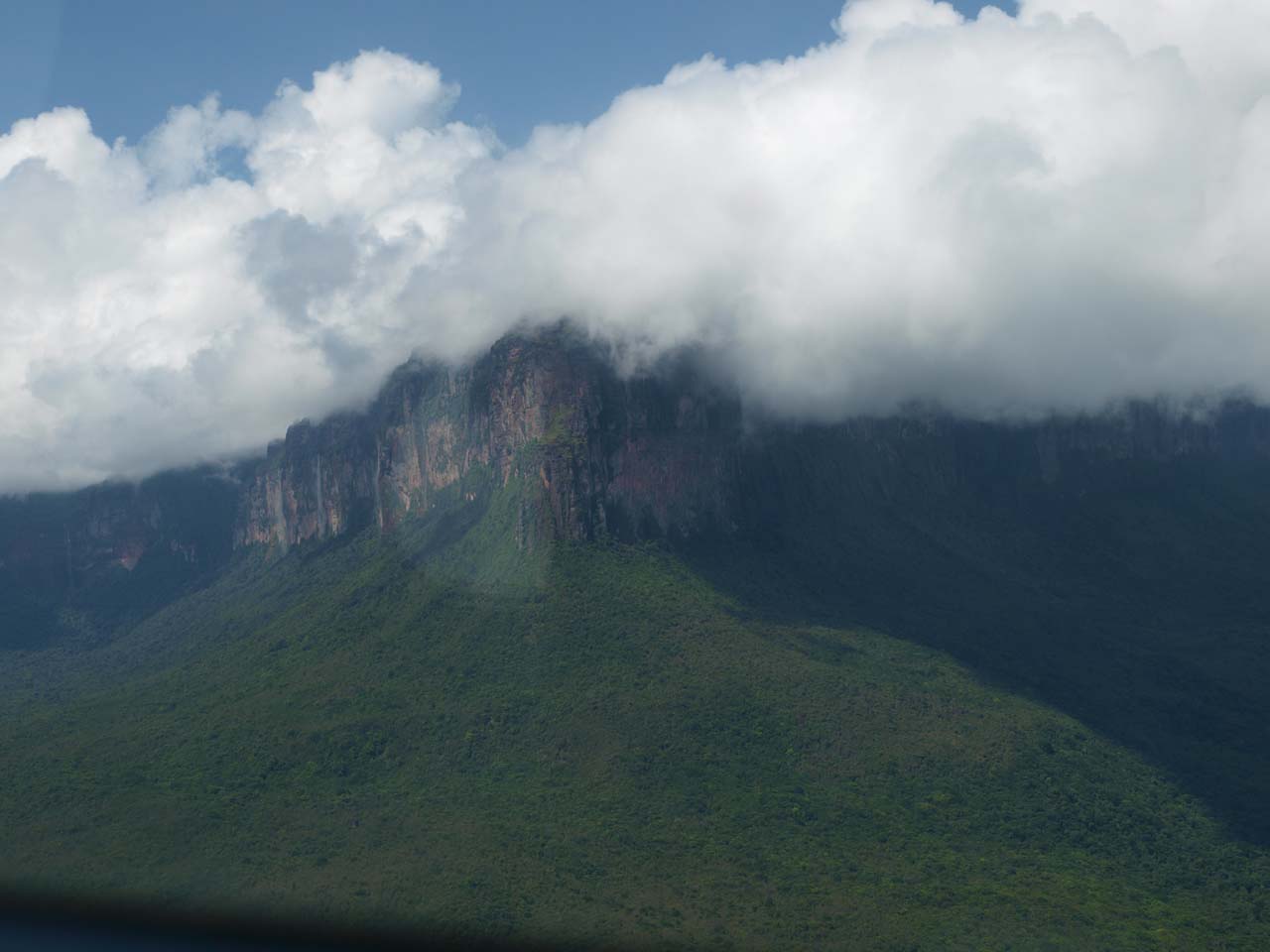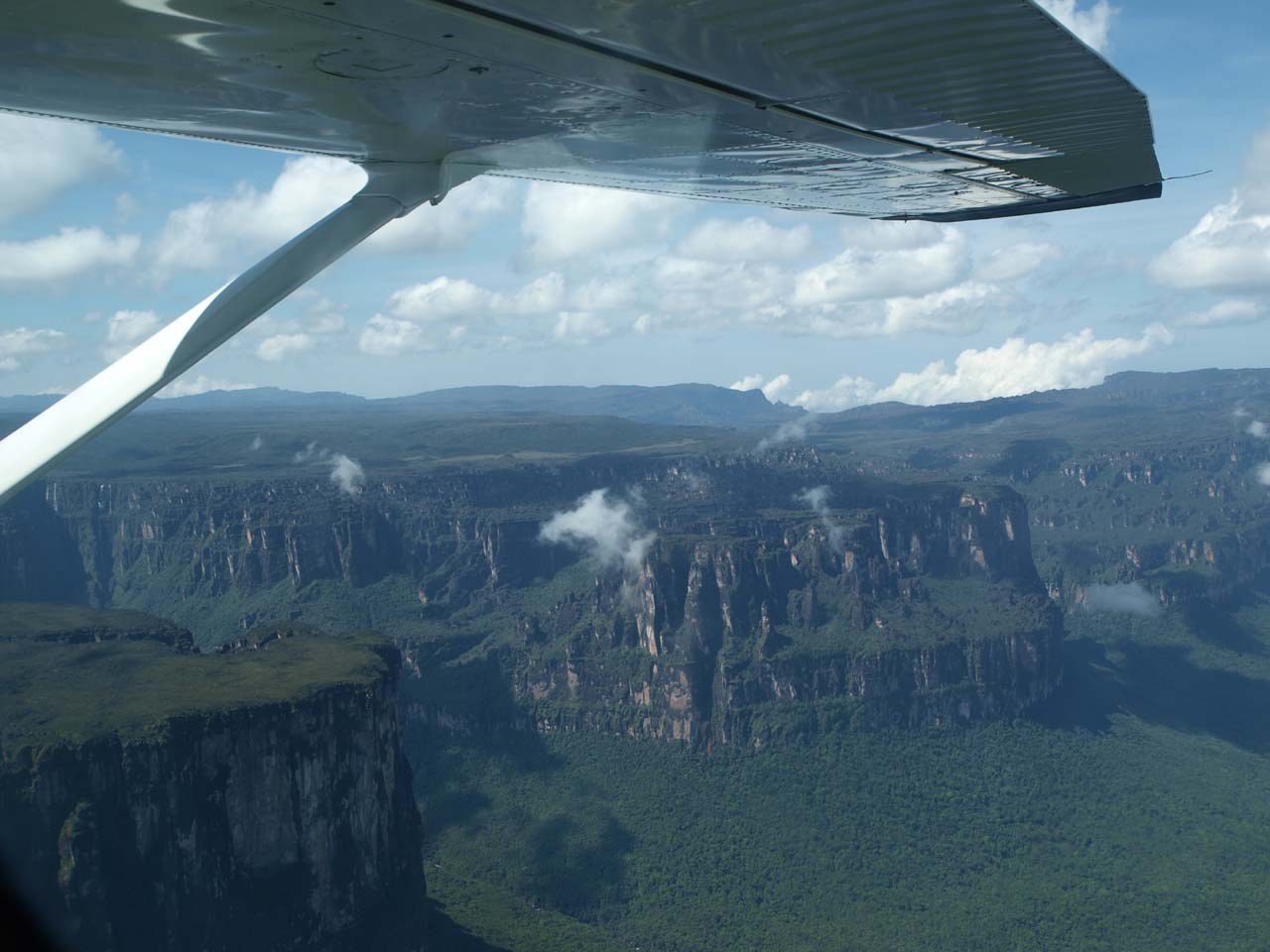 1時間近く後、第2班が出発。操縦席の斜め後ろの席でした。昨日苦労して遡ったところをひとっ飛び、あっといまにアウヤン・テプイの奥に着きます。セスナは何回もエンジェル・フォールに接近します。大満足。帰りはカラオ川の水面すれすれに飛んでくれました。45分ほどの飛行でした。