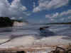 遊覧飛行の後、直接サポの滝を目指します。ラグーン(潟)と呼ばれているカナイマ湖を船で渡り、アナトリー島に向かいます。とちゅう、カライマ湖に落ちるカラオ川の滝がいくつもあります。落差はそれほどでもありませんが、何しろ水量が多いので、迫力があります。.水面には植物繊維がつくる泡(地元の人は石けんとして利用するらしい)がたくさん浮かんでいます。