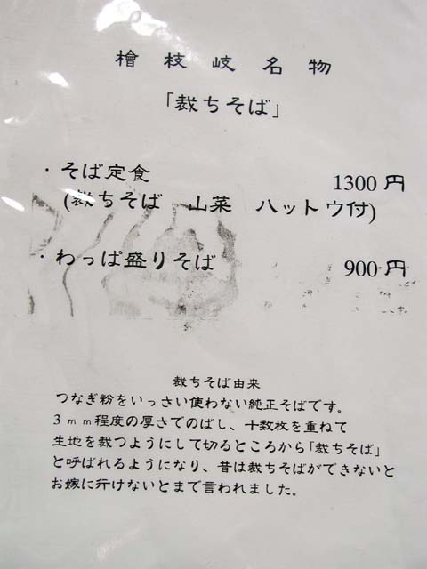 裁ちそばが檜枝岐の名物のようです。いろいろなお店に看板が出ていました。村の中心部ちかくのかどやさんで食べてみました。そのあとで、村営の公衆浴場燧湯に入りました。公衆浴場はもう一件(駒ノ湯)あります。