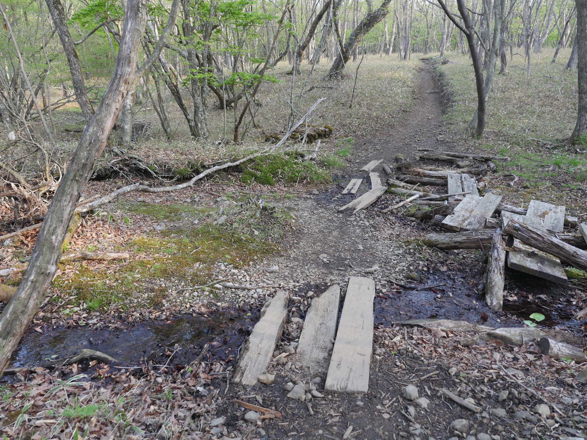 下りは意外と急降下でした。それが終われば後はほぼ平坦な道、明るい木立の中の道となります。小さな祠があったり、細い水路を渡ったりします。ここは頂上部なのに水が流れていて、水場にもなっています。相沢・三ツ瀬からの登山道と合流すると艫岩も近い。艫岩には6時15分ころに到着。艫は船尾のことです。大きな船に見立てた荒船山の船尾に当たる場所です。四阿やベンチがあります。ただ、四阿のトイレは使用不可、整備の予定は当面ないようです。