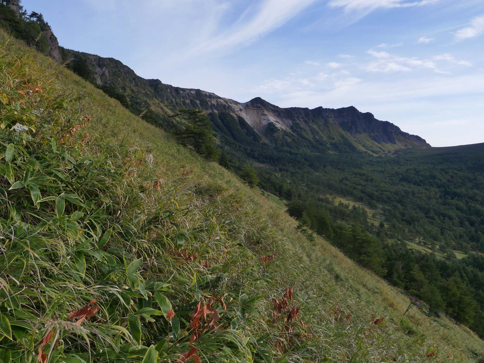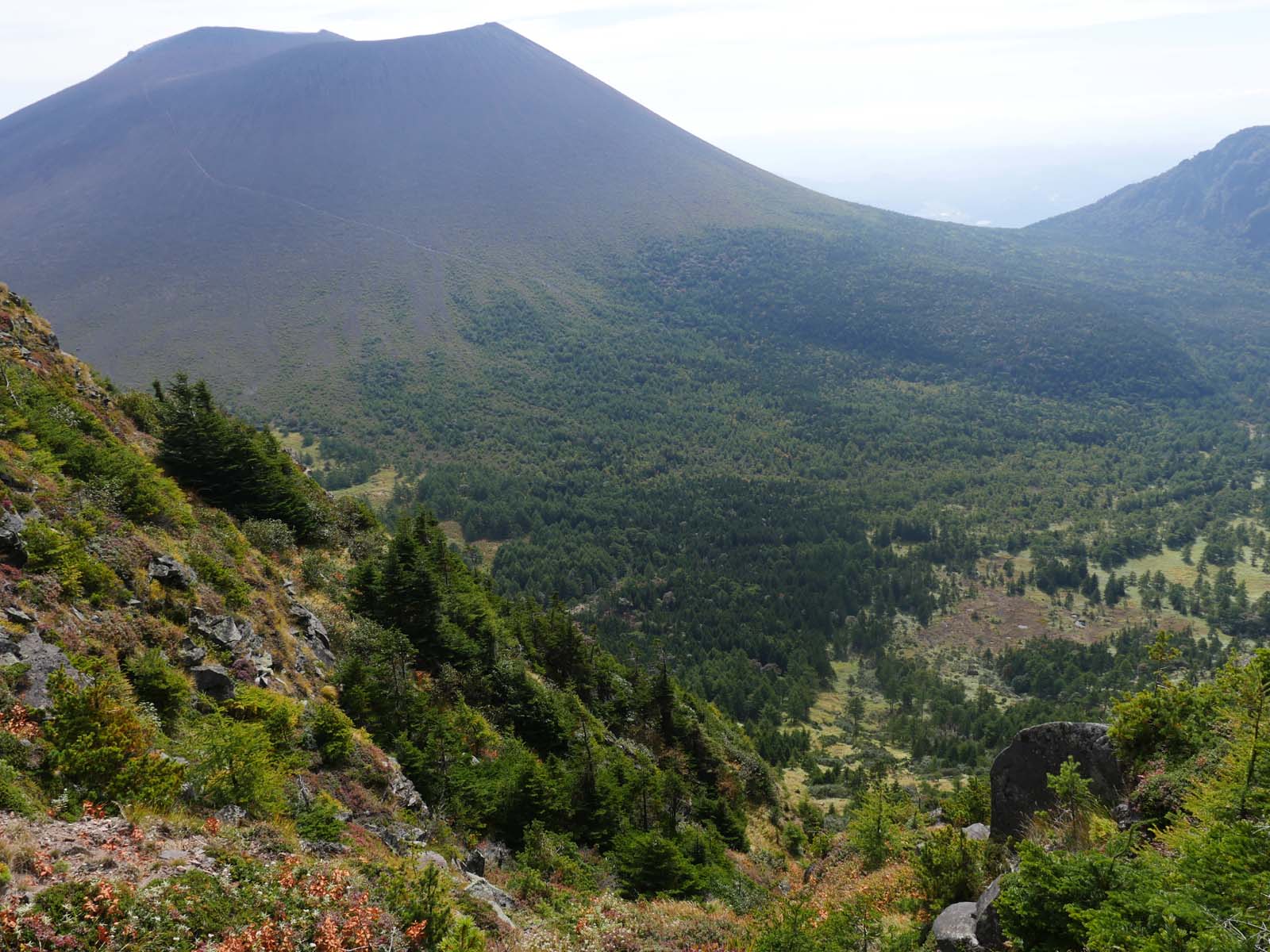 ここまで快調だったので、草すべりを降りて湯の平へ、そしてJバンドを登って戻ることにしました。草すべりはものすごい急降下です(一番下の標高のグラフ参照)。カルデラ壁を降りるのですから仕方ありません。やっとの思いで湯の平口まで降りました。ここから賽の河原まではカルデラの底を歩くことになります。最初は森の中の緩い登り、浅間山への登山道をわかるころから木がなくなり開けてきます。