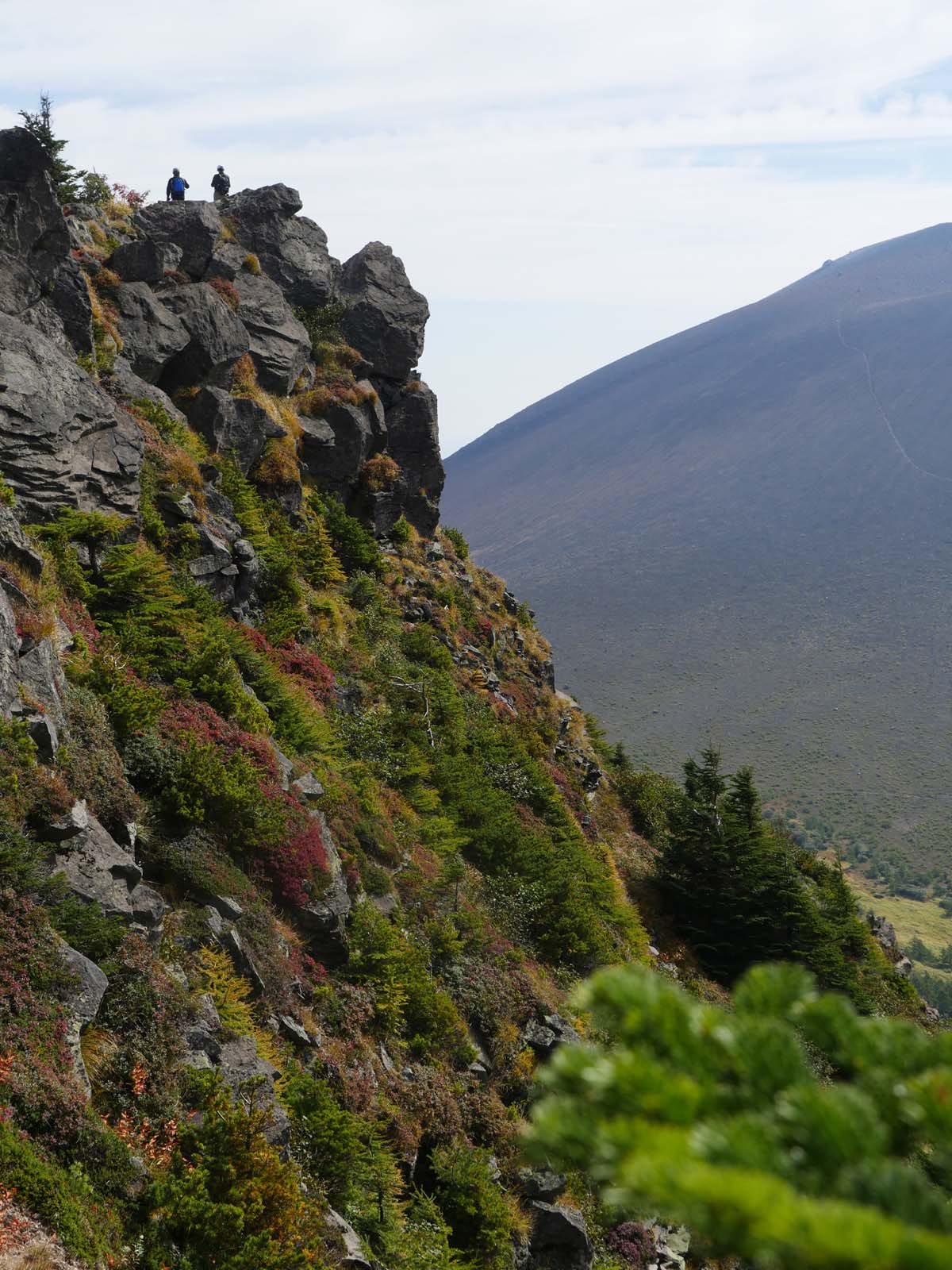Jバンドは急登、最後は岩場になります。でも、草すべりを登ることを考えたら、距離が短いのでそのぶん楽です。ここを登り切れば、あとは黒斑山まではカルデラ壁の崖に近づき少し切り立ったところや、また小さな岩場もあったりしますが、基本緩い登りです。何よりも展望が素晴らしい。外輪山最高峰黒斑山(2402m)は最後の登り、少しきつい。登ると大勢の人がいました。頂上直下のテラスでは豪華な食事を作ろうとしているグループもいました。こちらも行動食(パンとチーズ)を食べながら大休止、展望を楽しみます。