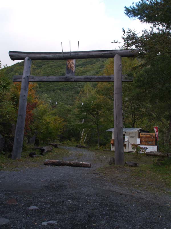 朝食後、車内を整理して、天狗温泉への道に入ります。天狗温泉の駐車場で身支度を調え、朝6時50分ころ出発、火山館を目指します。天気はよくなってきません。途中分岐がありますが、山側コース(不動滝でない方)を選びます。イオウ(硫化水素)のにおいがすると火山館は近い。このあたりは結構紅葉が進んでいます。火山館は8時30分ころ。少し休みます。