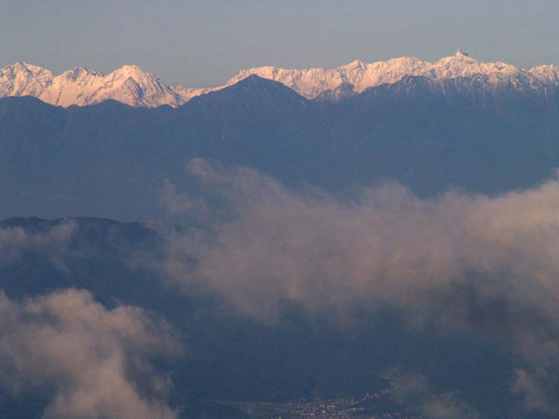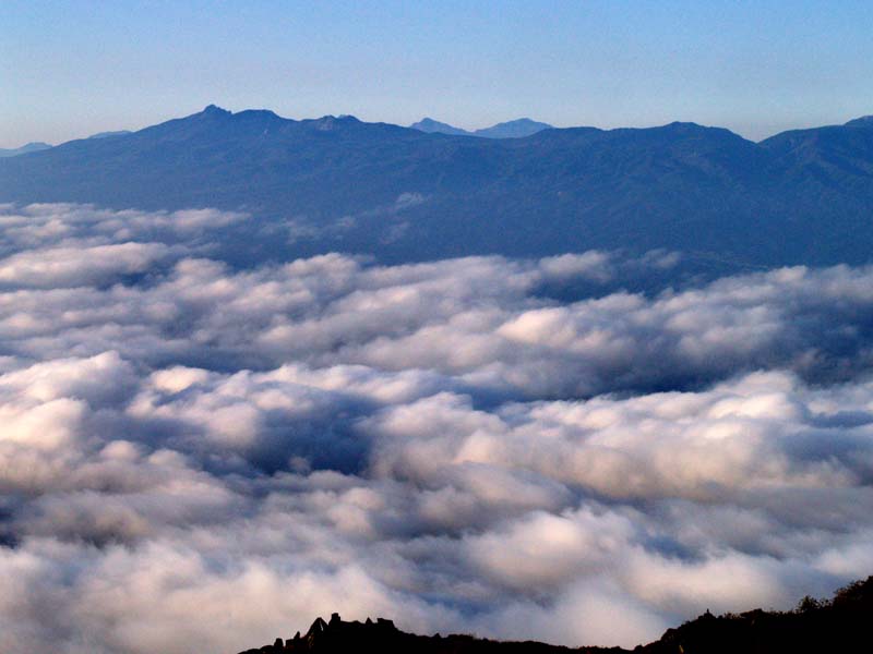 5時40分ころ出発。少し短い時間でトーミの頭に到着できそうな中コースを選びます。ト−ミの頭は6時40分ころ。ものすごい展望。富士山、八ヶ岳、中央アルプス、木曽御嶽、そして北アルプス。もちろん眼前には浅間山。大展望をしばし楽しみます。