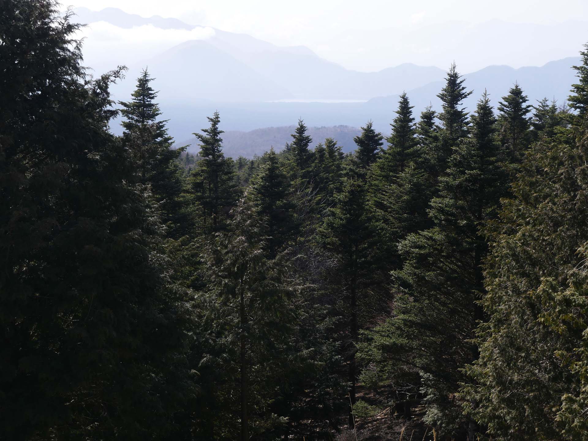 食後歩き出したら、三湖台はすぐでした。ここは広々とした場所で、展望テラス(無料)やベンチもあります。西湖が真下に見え、本栖湖もかすかに見えます。二つの湖の間にあるはずの精進湖(しょうじこ)は見えません。遠くには南アルプスの主峰(北の北岳から南の聖岳まで)が見えます。西湖の北には御坂山塊(王岳、鬼ヶ岳、十二ヶ岳など)が見えます。少し展望を楽しんでから、五湖台を目指して出発。