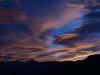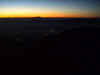 | 東側の空が明るくなってきました。下には安曇野の街の灯が見えます。 | うっすらと槍が見えてきました。槍ヶ岳山荘の灯もも見えます。 | 穂高の上にはほぼ満月の月が出ています(月齢約17日)。 | ご来光です。残念ながらこの方向には雲があります。雲の上に頭を出ているのは、左側が雨飾山、火打・妙高、戸隠、高妻山など、右が浅間山などです。 | 穂高連峰が、鮮やかなモルゲンロートとまではいきませんが、少し赤くなりました。 |