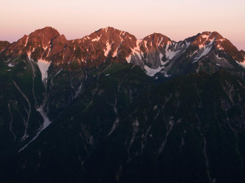 | 左から前穂、奥穂、涸沢岳、北穂。 | 大キレット。きれいなカール。 | 南岳から槍ヶ岳の稜線。 | 蝶ヶ岳ヒュッテ。背景は喜作新道が通る大天井岳〜赤石岳〜西岳の稜線。 | 雄大な穂高から槍の稜線。下には梓川も見える。手前の花はダイコンソウ。 |