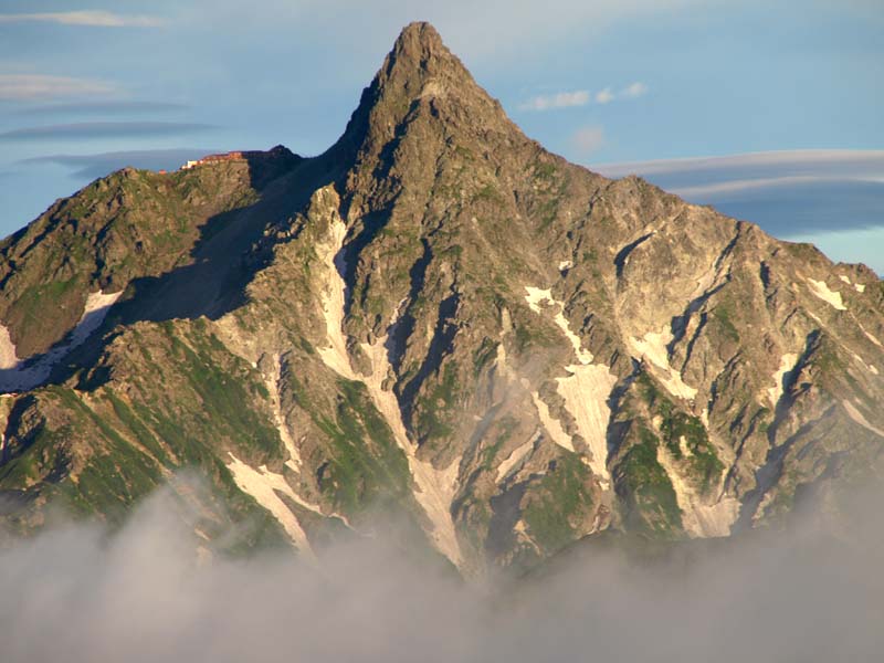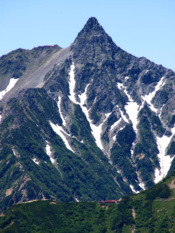 | 奥穂高の岩壁。右に穂高岳山荘に向かうザイテングラートが見えます。 | 蝶ヶ岳から常念岳への縦走路。昨日歩いた道。 | 槍ヶ岳と槍ヶ岳山荘。そして、天狗原の見事なカール。 | 北穂高山頂に建つ北穂高小屋。 | 前穂高。右が奥穂高岳に通じる吊り尾根。下へ北尾根が延びています。 |