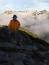 5時半過ぎに頂上到着。幸いガスは流れているので、穂高から槍の稜線が見えるときもあります。まわりの山々の写真を撮ったり、まだ見えるブロッケン現象の写真を撮ったりしてしばらく頂上に滞在。