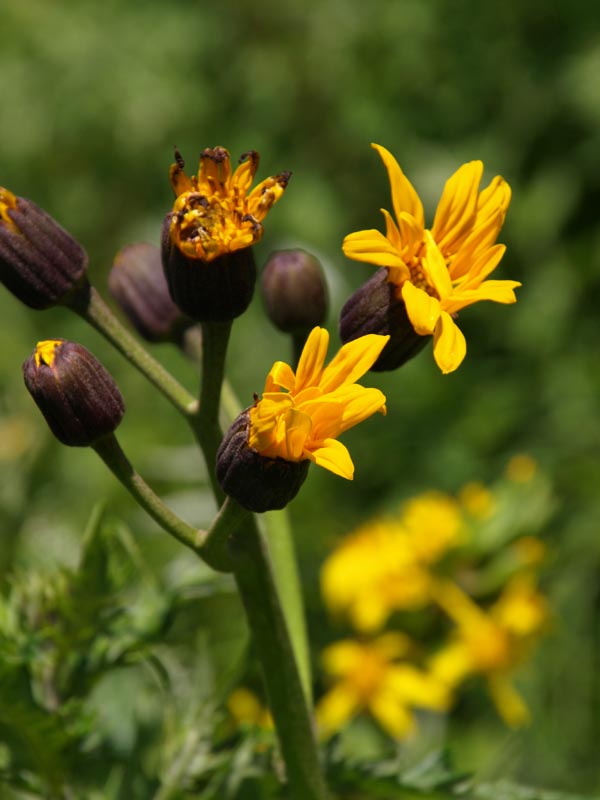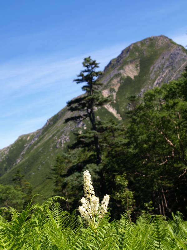 蝶槍からはかなり下ります。風は相変わらず強いのですが、道が稜線の東側に来ると風も弱く、日当たりのいい場所は高山植物の大群落になっていました。さらに下って、一度樹林帯の中に入ります。