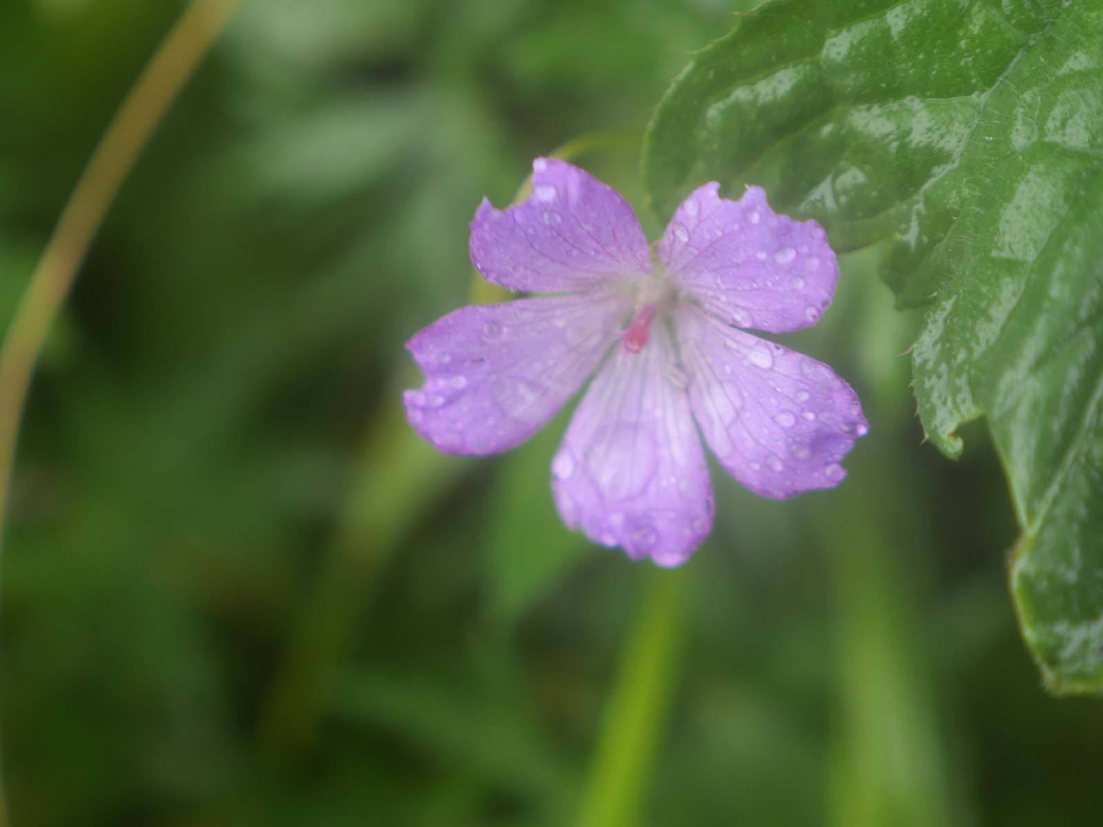 常念岳の頂上(2857m)には7時25分ころに到着しました。雨は止む気配もありません。まったく景色が見られないので、少し休んだけで出発します。雨は本降りになってきました。ここから急降下、約400mほど下り、森林限界の下の樹林帯に入ります。樹林帯の終わりころ、蝶槍への登り付近から見事なお花畑が現れます。