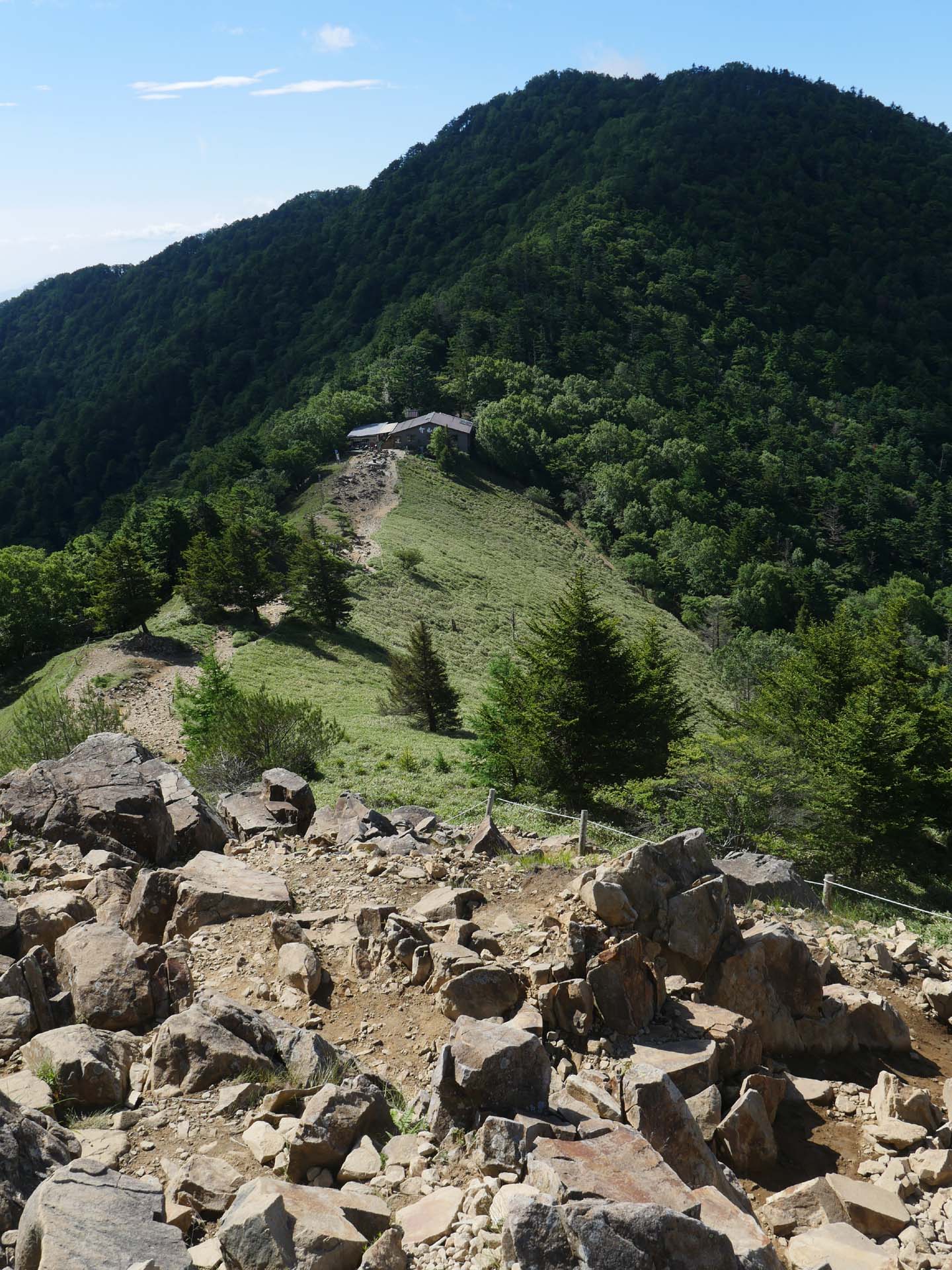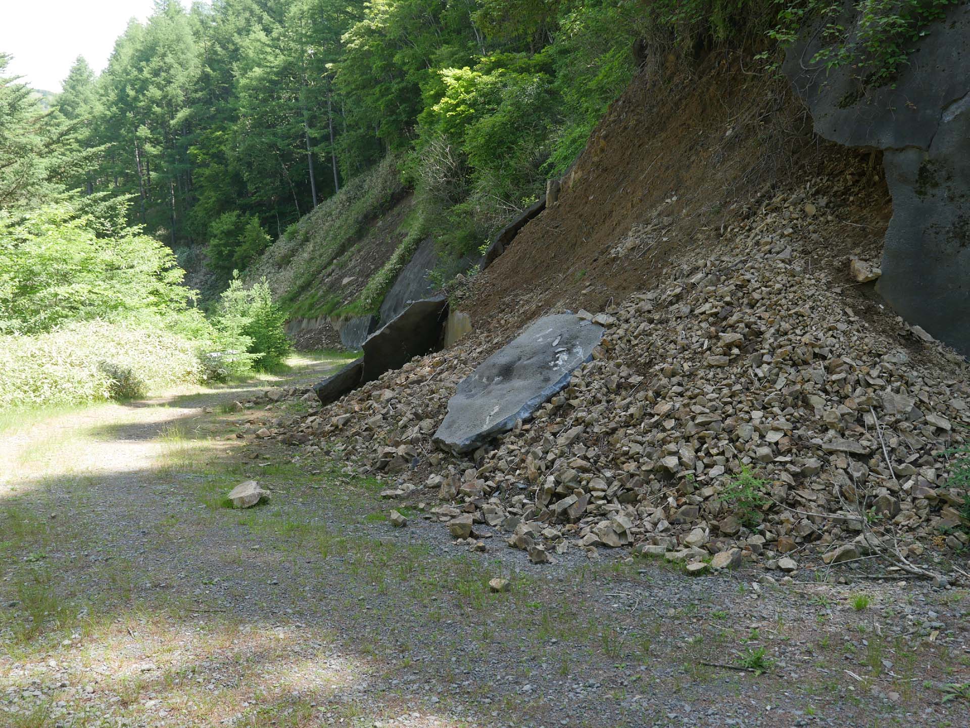 | 展望のいい道。 | 林の中を下ります。 | 未舗装の林道に出ました。 | 登山道の道標。 | 崩壊して使えなくなったかつての登山道入り口。 |