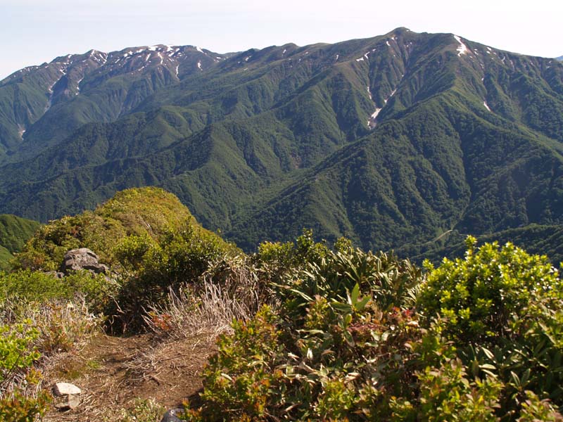 だんだん灌木が低くなるとヤスケ尾根です。いったん道は緩くなります。ふたたび急登、岩場も混じってきます。最後の岩場を登り切ると大源太山頂上です(1598m)。7時45分でした。360°の大展望。梅雨に入ったとは思えない空気の透明度です。食事をかねて大休止。展望を楽しんでいたら、若い方が登ってきました。愛知県から(スクーターで)来たそうです。しばらくして、七つ小屋の方へ降りていきました。