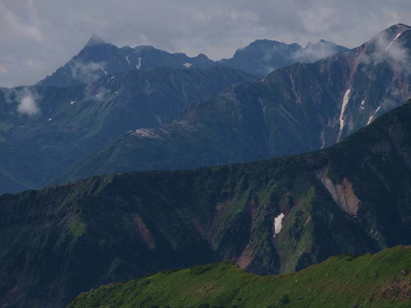 山荘側のピークの方が展望がよく、少し標高も高い(2501m)のでそちらに移動することにしました。剣岳の方は相変わらずですが、薬師岳はきれいに見えるので、我慢して待つことにしました。そのうち、カップルも一組登ってきました。そうこうするうちに、とうとう剣岳も見え始めました。登ってきてよかった。
