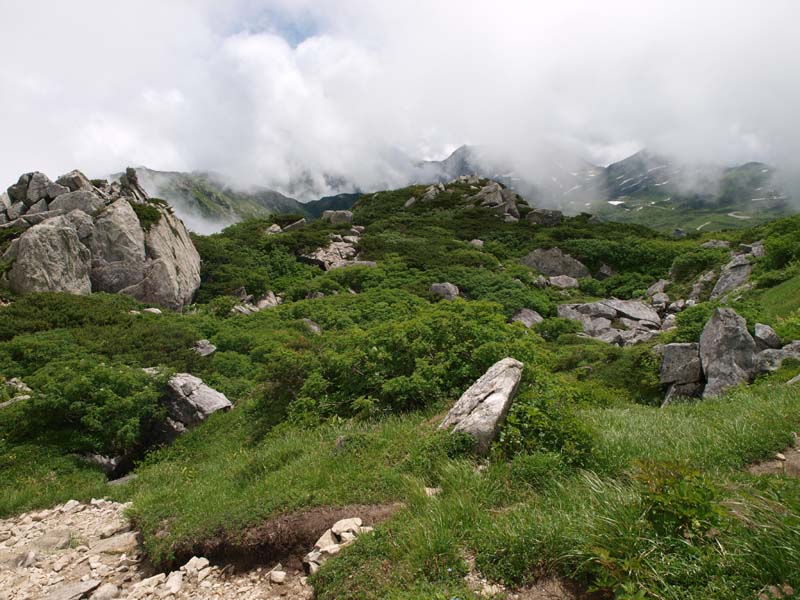 頂上を越えると何カ所か鎖、はしごの急降下があり、またいくつかのピークを越えることになります。かなり疲れたので、七福園というところで大休止。昼食とします。ここはよく雷鳥が登場するそうですが、あいにく会うことができませんでした。このコースはたくさんの種類の花があるので、展望がなくても楽しめそうです。