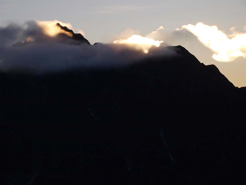 朝早く起き出して、大日岳でご来光を待つことにしました。ただ、ガスが漂い天気は微妙です。夜は満天の星だったらしいのに。3時45分頃、まだ暗いのですがヘッドランプを頼りに、薄手のウールの長袖カッターシャツ、さらにレインウェアを防寒・防風用に羽織って大日岳の頂上へ向け出発。4時15分頃に三角点のある頂上(2498m)に到着。剣岳の方はガスっていますが、富山市の夜景はきれいに見えます。だんだん白み始めると薬師岳が見え始めます。ただ、剣岳方面はガスに覆われています。