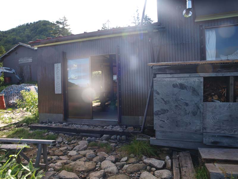 最後のピーク、中大日岳を越えると木道になり、小屋が近いことを伺わせます。小屋には11時45分頃に到着しました。早速宿泊手続きをとりました。1泊2食付きで9,000円です。何人かに追い抜かれたのですが、その人たちはすでに下ったみたいで、泊まり客としては私が一番だったようです。2段ベッドの一番端が私の場所になりました。この日は団体も入り、2畳で3人寝るという混みようでした。