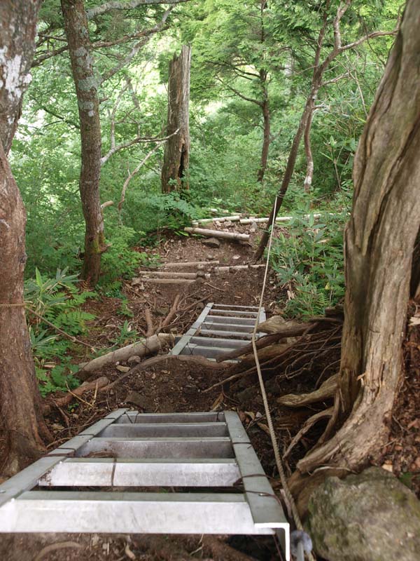 分岐を6時40分に出発。最初はかなりの急降下です。大日平まで降りると木道になります。大日山荘周辺、またこの大日平山荘周辺の木道はきちんと滑り止めがあり、これなら濡れていても安心です。大日平山荘を過ぎ、木道は牛首まで続きます。そして牛首から称名滝まではこれでもかといわんばかりの急降下の連続です。心配していた膝も痛くなってきました。痛いばかりではなく、時々力が入らなくなるので危ない。ストックがなければ降りられなかったでしょう。途中、沢が崩れて発生した土石流が登山道を寸断してしまった箇所があります。一応土の急斜面にザイルを垂らした仮設道ができています。ザイルがなければとても降りる気になりません。2名の作業員が、登山道を修復作業をしていました。こんなところに道をつけるのですから大変な作業です。それに、崩れた沢の上部の岩盤が不安定、でもその沢を横断しなくてはならないので、大雨になってしまうとまた崩壊の可能性があります。