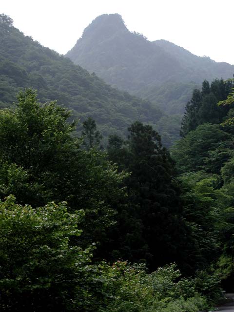 出発は6時35分。最初は沢沿いの緩い登りです。しかし一つの沢を越すときに、ロープを使って登るような急登が登場。これを越えるときつい登りが連続。コルの直下は雨上がりの滑りやすい道を、垂らしてあるロープを頼りに登ります。コルは7時45分。ここは、烏帽子岳とマルの分岐です。マルは展望がないというのでパスして、左の烏帽子岳の道を上ります。頂上の岩場を巻きながらようやく、標高の割に高度感のある頂上へ。頂上までも結構厳しい登りです。頂上到着は7時50分でした。よく晴れていれば展望抜群でしょう。記念写真を撮ったりして少し休みます。