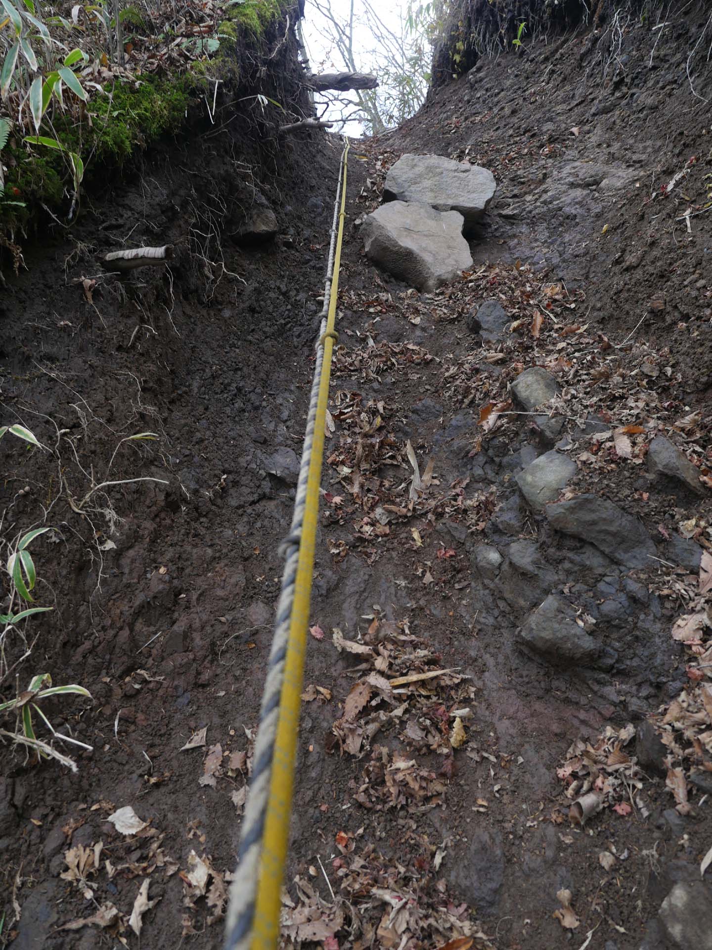 ここから十六曲峠近くまでは結構な急坂となります。十六曲峠の少し手前が鼻曲山と剣の峰・角落(つのおち)山の分岐です。このあとは霧積のぞきなどの崩落箇所もありますが、それほど危険なところはなく比較的楽な尾根道です。ただ、途中のピークを越える前後がかなりの急坂です。