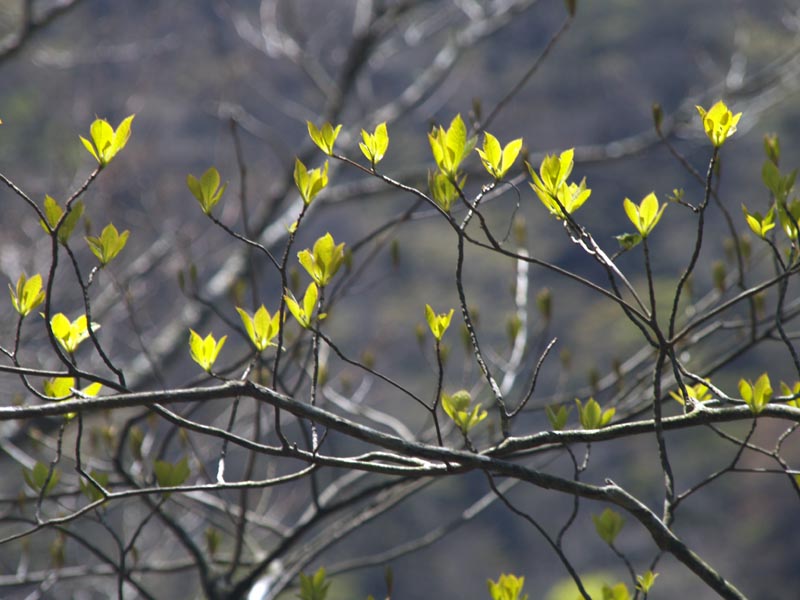 ツツジ新道の初めは急降下。上の方はまだ新緑にはなっていませんでしたが、下るに従って高ェ増えてくる感じです。道はいったん緩くなりますが、ゴーラ沢出会いに降りるところが急降下。ここからた登り直して、またかなり歩きます。ウェルキャンプ場のざわめきが聞こえ始め、ようやく林道に出ました。12時45分でした。ここまで来れば、西丹沢自然教室近くの駐車場は近い。