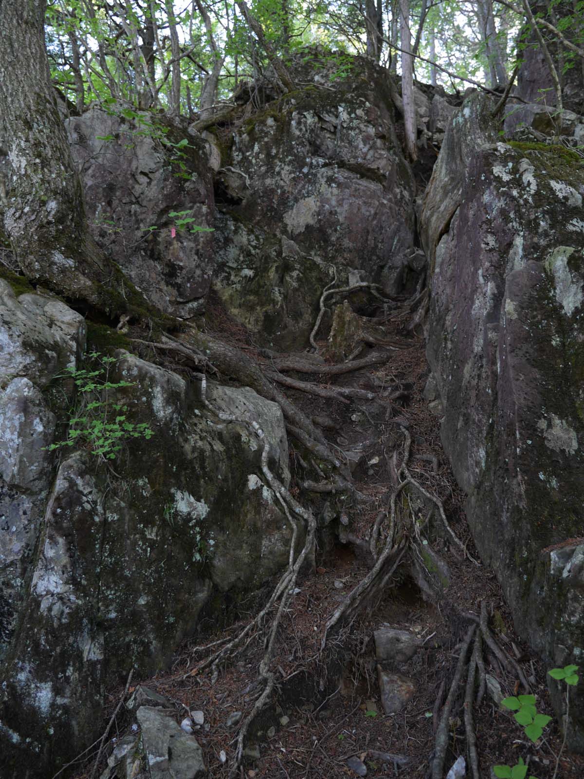 林道を横切ると、また緩い登りになり、黒川金山跡へ降りる道の分岐、そしてすぐに落合集落への分岐横手山峠に出ます。ようやくここから山道らしい登りになります。とはいっても、ふつうの山よりは遙かに楽な登りです。途中、シカに会いましたが、写真は撮れませんでした。その代わり鳴き声をビデオに収めました。