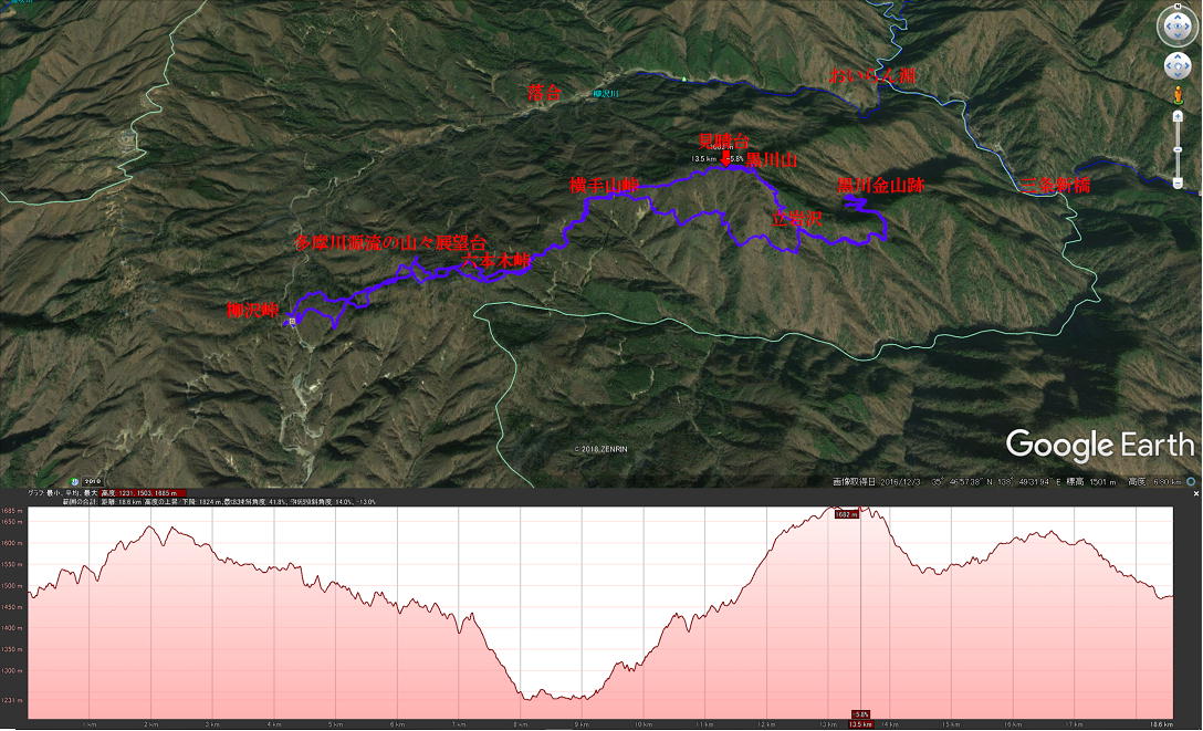 | 上の図をクリックするとこの日の行程をgoogle mapでご覧いただけます。ただ、柳沢峠から六本木峠付近は精度が悪いです。同じ道を往復したのに、かなり違う道になっています。 |