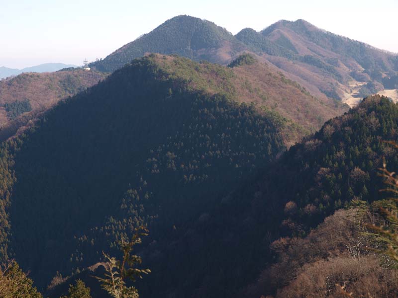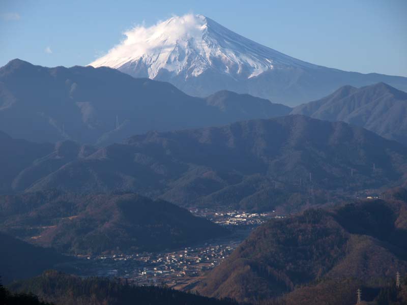 あと少しで富士見平というところに、「展望よい」という天狗岩への分岐があったので、寄り道してみます。確かに展望がよいポイントでした。元に戻って、少し登ると稜線。さらに少し登ると富士見平、さらに頂上(970m)です。頂上は8時55分。頂上は北側が開けています。遠くに見える雲取山は雪をかぶっているようです。数枚写真を撮って、富士見平に戻ります。ここでは三脚を立てて記念写真や風景写真。もう一人登ってきました。ウールのカッターシャツも脱いで、Tシャツ一枚になりました。風もなく、太陽が出ているので暖かい。