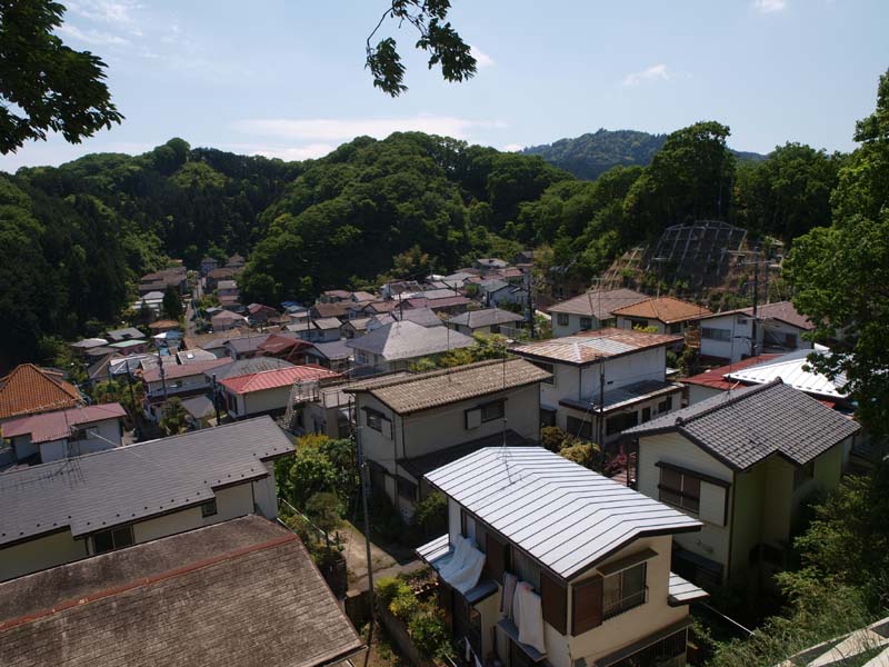 ここからも尾根道、まだまだアップダウンが続きます。つらい。最後に金比羅山経由の道と、三和団地(三和住宅団地)の道に分かれます。三和団地は山に囲まれた隠れ里みたいな団地でした。金比羅山なら展望があると思って、少し登って金比羅山の道を選びました。ここが最後の登りです。鳥居をくぐり金比羅さんに。でも、展望はありませんでした。金比羅さんを抜けると民家の横をすり抜けるように道が続き、やがて山道の下りとなって車道に出ました。13時5分ころになっていました。右へ行くと三和団地、左に行くと高尾駅方面です。ここから高尾駅(JR&京王線)は10分ほどです。